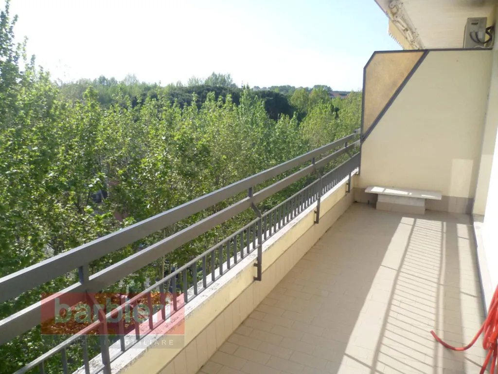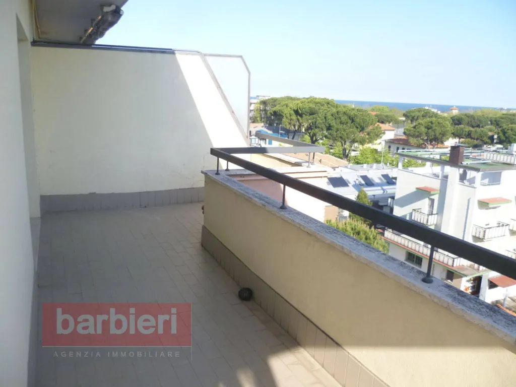 Ampio balcone angolare su due lati, parzialmente verandato, a cui accedere da porta finestra sia in soggiorno sia nelle camere, dotato di vista panoramica verso il centro di Cervia e vista mare laterale porta finestra sia in soggiorno sia nelle camere.