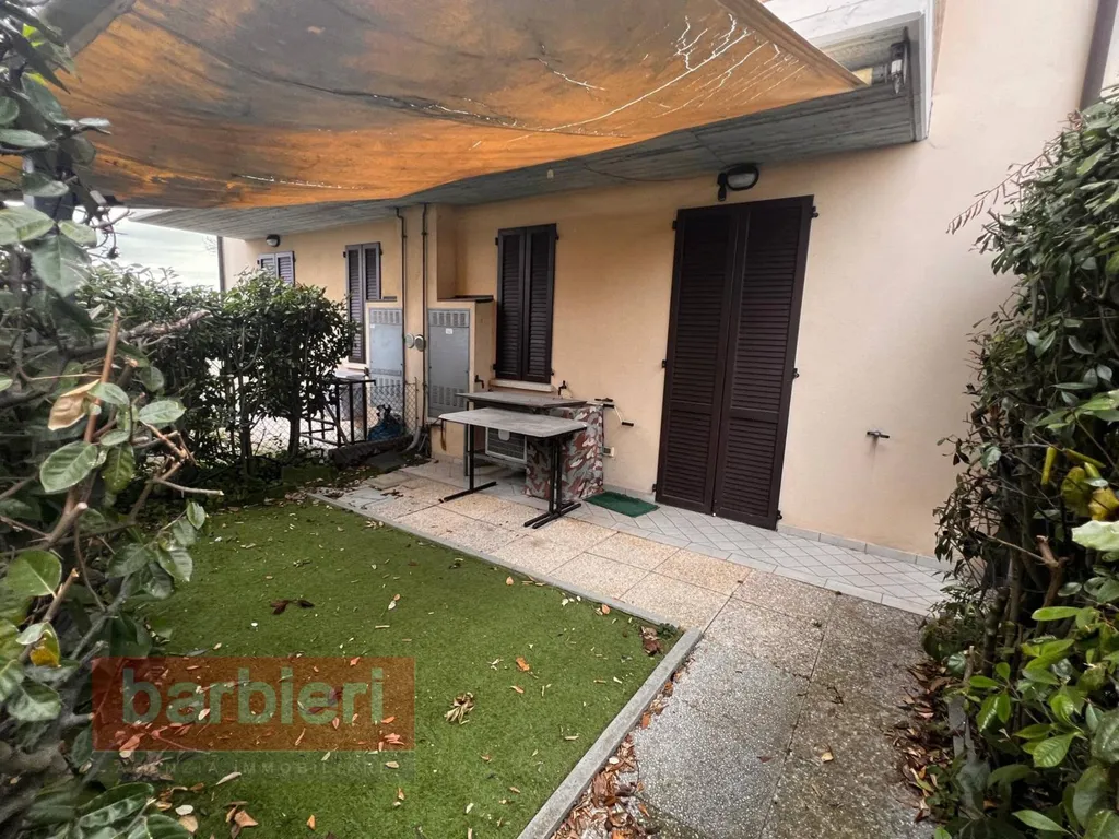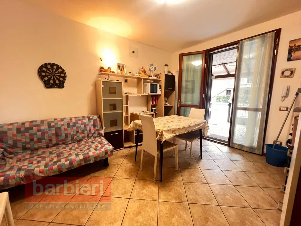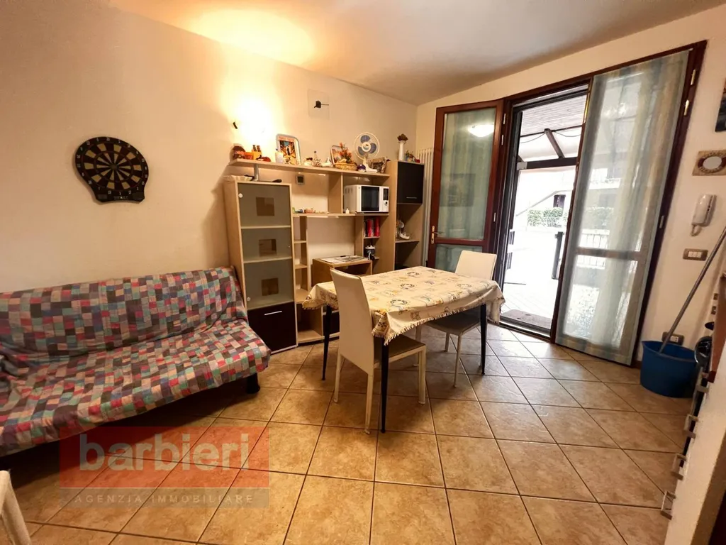 Limmobile si apre su un luminoso soggiorno con angolo cottura, con accesso diretto alla corte privata, ideale per pranzi allaperto e momenti di relax.